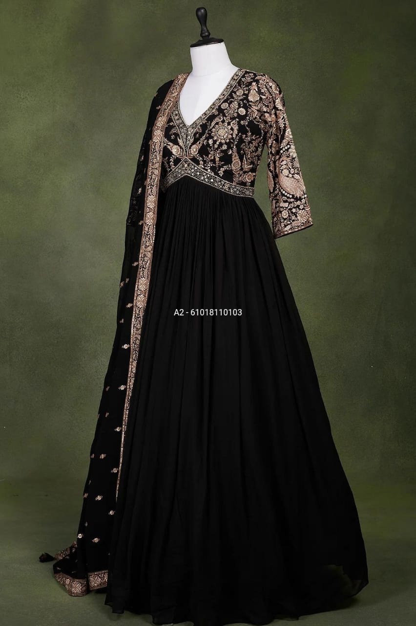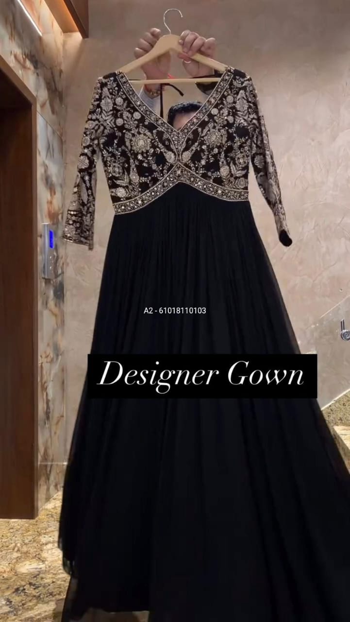 Make a statement with this exquisitely designed heavy faux georgette gown. The delicate embroidery and dazzling sequins work add a touch of glamour, making it perfect for weddings, parties, and festive occasions. The gown comes with a micro cotton inner, ensuring comfort while maintaining a luxurious look. Its flowing silhouette and intricate detailing enhance its charm, making it a must-have for your wardrobe.
