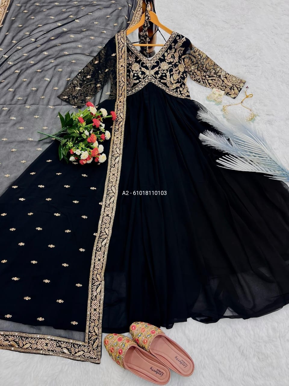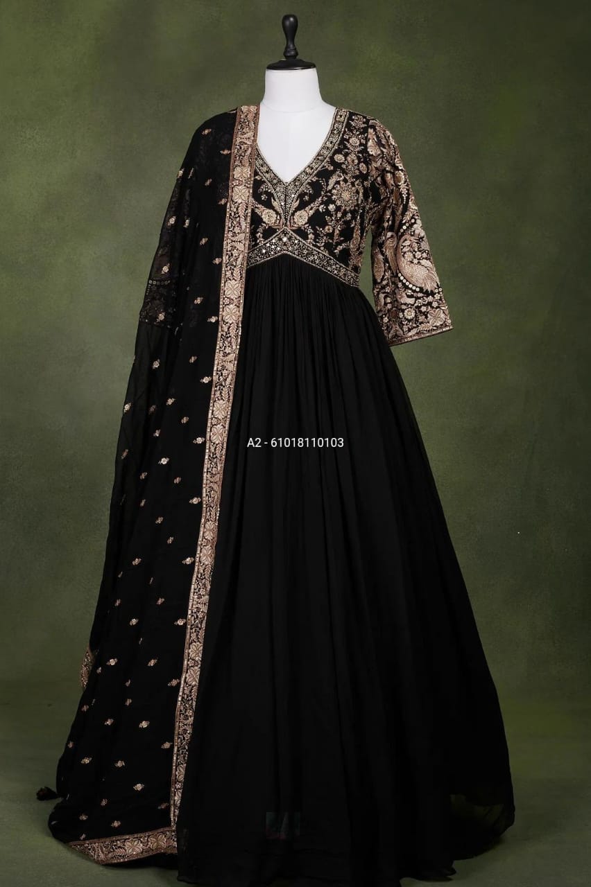 Step into elegance with this stunning heavy faux georgette gown, featuring intricate embroidery and shimmering sequins work. Designed with a soft micro cotton inner for all-day comfort.